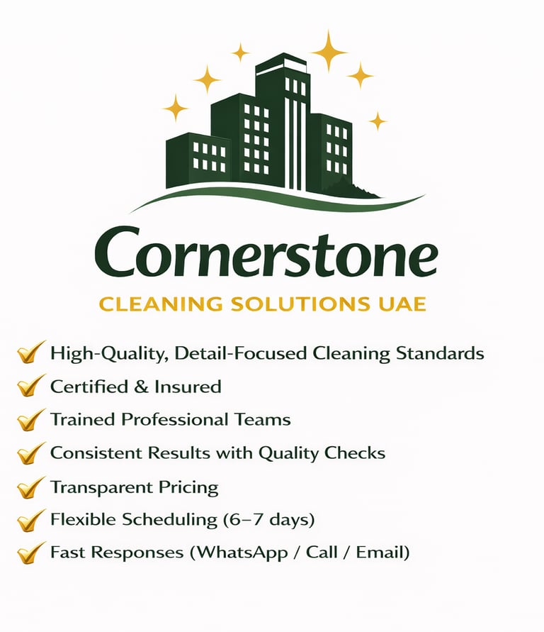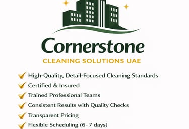 Cornerstone Cleaning Solutions UAE delivers dependable, professional cleaning for residential and commercial spaces in Dubai. We focus on quality, reliability, and attention to detail — ensuring every clean meets our high standards.