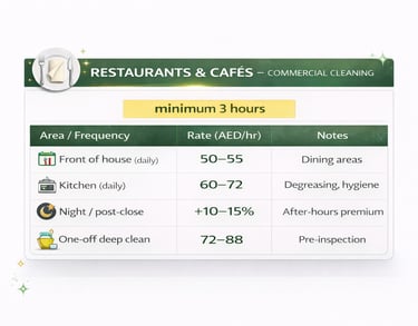 Cleaning and maintenance of dining areas, including tables, chairs, floors, and visible surfaces